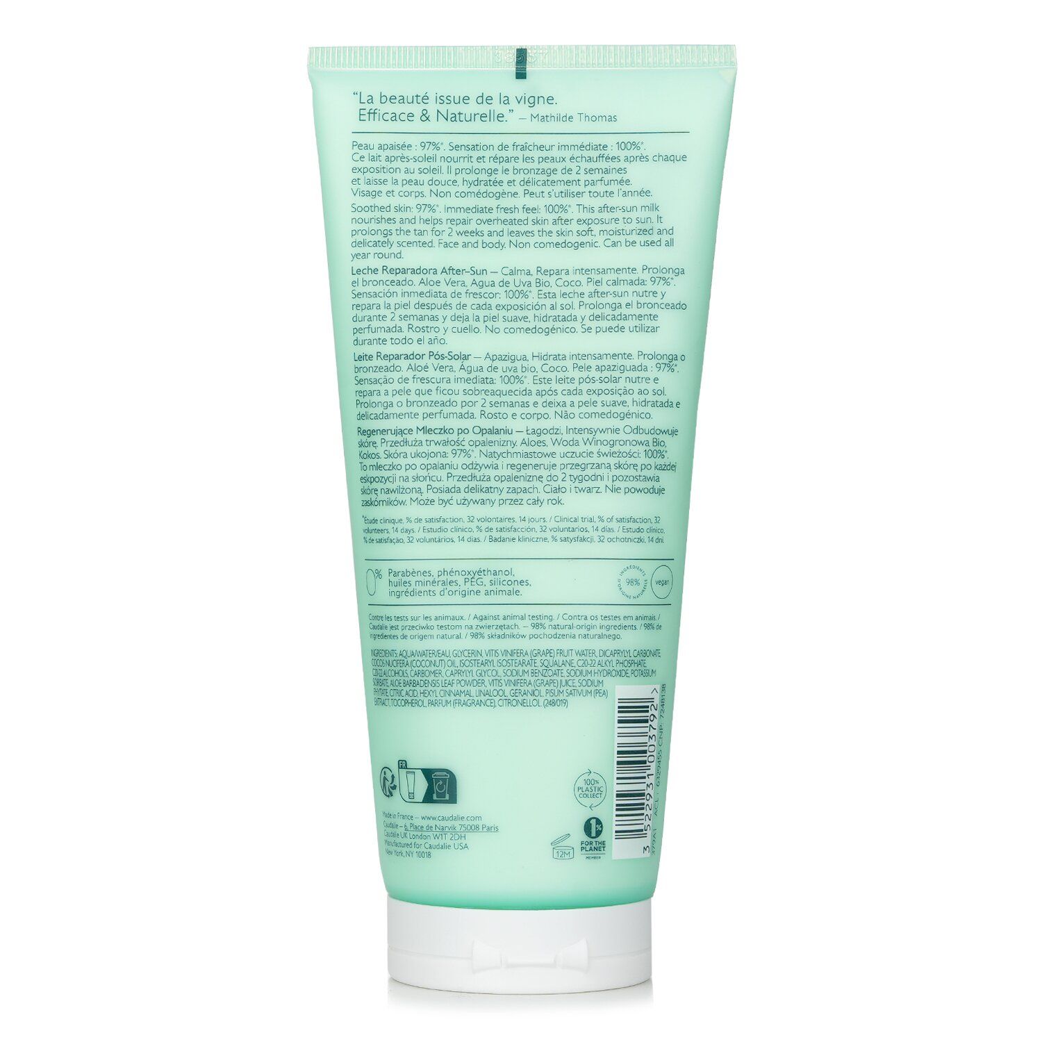 A restorative after-sun careIntensely moisturizes, soothes &repair heated skin after sun exposureFeatures a comfortable milky texture, offers an immediate feeling of freshnessFormula is composed of 98% ingredients of natural originAloe vera extracts hydrate, soothe & retain water in skinOrganic grape water gives antioxidant & prebiotic benefitCoconut oil nourishes dry & peeling skinFor a long-lasting tan for at least 2 more weeksIdeal for strengthening the skin microbiomeLeaves beautifully scented sun-kissed skin with a beautiful & luminous tanSuitable for all skin types, both on the body & faceNon-comedogenicVegan