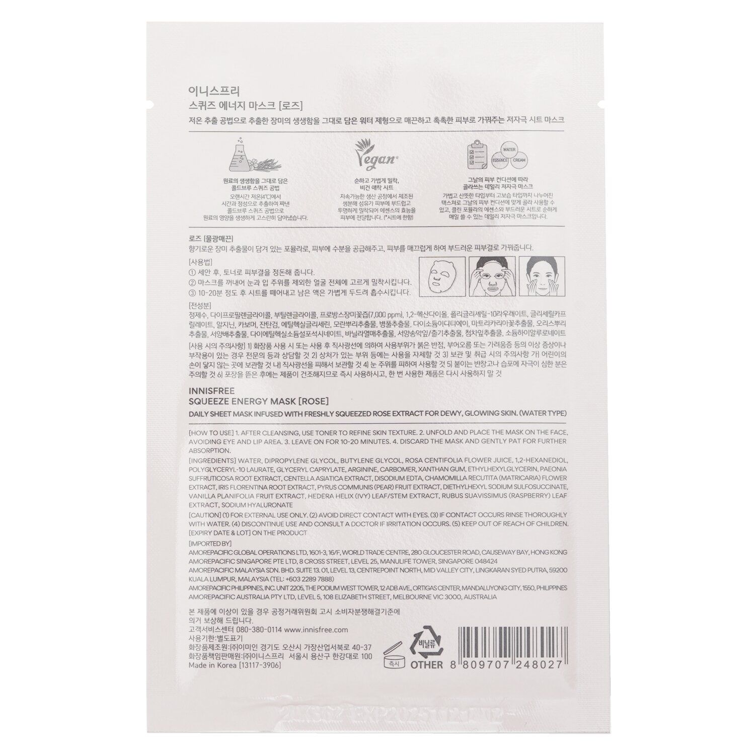 A refreshing water-type facial sheet maskMade from 100% biodegradable Eucalyptus fibers with an easy-peel design that adheres to the face gently & delivers the concentrate effectivelyInfused with freshly-squeezed rose extracts to provide lightweight hydrationHarnesses the Cold Brew Squeeze Process, which slowly extracts nutrients at low temperatures to capture its full benefits for nourishment boostLeaves skin dewy, glowing & refreshedFree of mineral oil, polyacrylamides, synthetic colorants, imidazolidinyl urea & triethanolamine