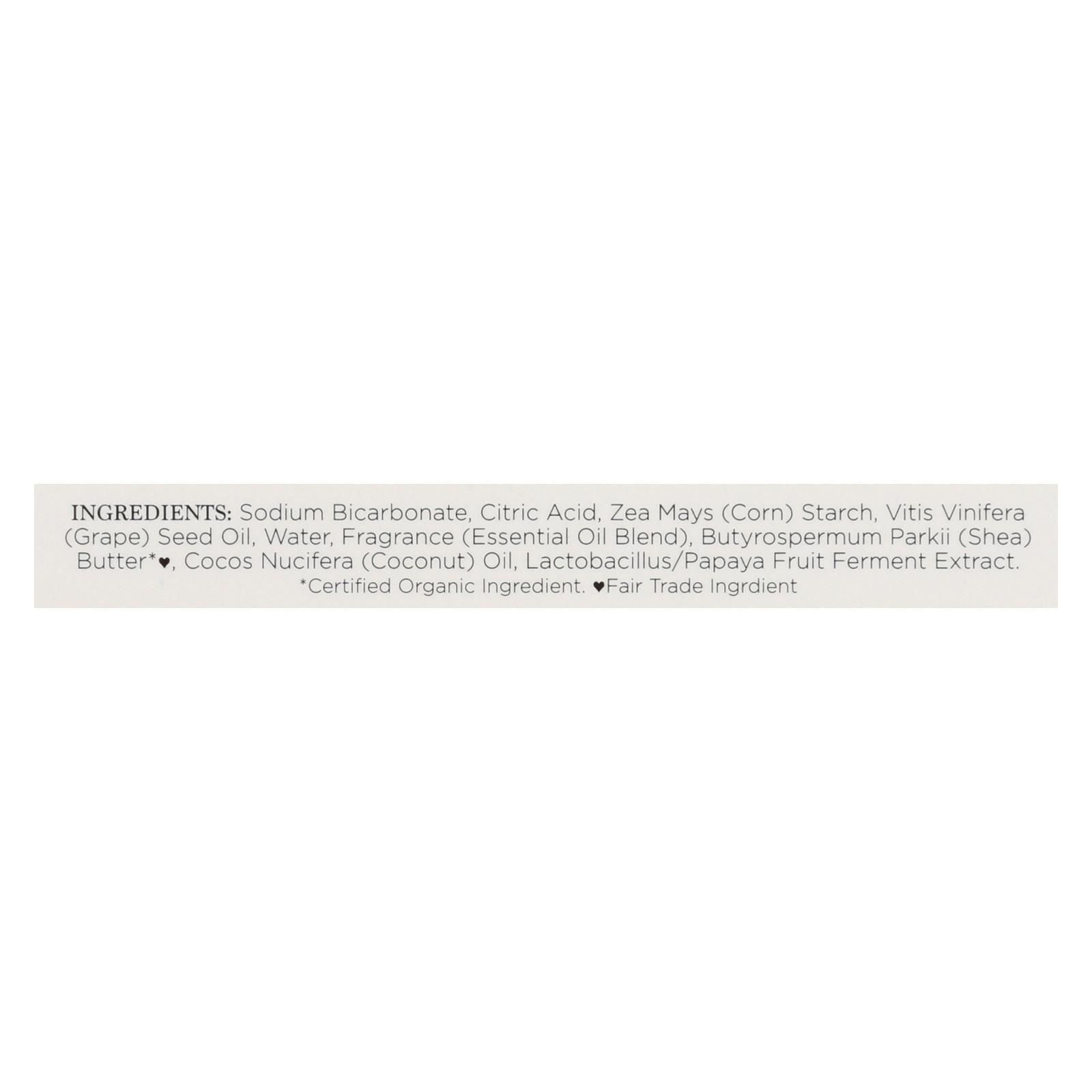 ingredients : sodium bicarbonate;citric acid;zea mays (corn) starch;vitis vinifera (grape) seed oil;water;fragrance (essential oil blend);butyrospermum parkii (shea) butter*♥;cocos nucifera (coconut) oil;lactobacillus/papaya fruit ferment extract;sodium bicarbonate;citric acid;zea mays (corn) starch;vitis vinifera (grape) seed oil;water;water;fragrance (essential oil blend);butyrospermum parkii (shea) butter*♥;cocos nucifera (coconut) oil;lactobacillus/papaya fruit ferment extract