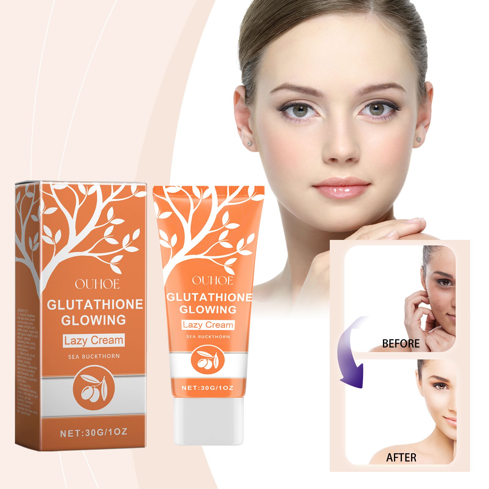 Our Glutathione Glowing Lazy Cream contains Glutathione, Hippophae Rhamnoides Extract, Ascorbic Acid. It can help whiten, even out skin tone, create flawless white skin, brighten skin tone, show a pale and tender glow, moisturize skin for a long time, moisturize skin without drying it out. The way to use it is very simple: wash your face, keep it dry, apply an appropriate amount of cream evenly on your face, and massage until it is absorbed. It deeply moisturizes, locks in moisture, and keeps skin moisturized throughout the day, giving it a smooth, light texture that moisturizes and nourishes.